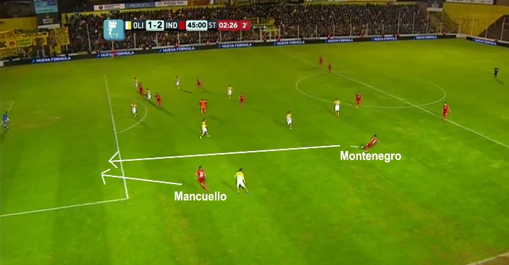 El primer tiempo, al igual que iba a ocurrir en el complemento, fue muy equilibrado entre los dos equipos. En esos primeros 45 minutos, el mejor de Independiente fue Daniel Montenegro, siempre activo y en la búsqueda de pases entre líneas. Además, tuvo un interesante remate desde afuera del área que se fue cerca del palo izquierdo de Nereo Champagne. En las siguientes dos imágenes se ven dos asistencias perfectas que dio el Rolfi. En una, Méndez no llegó por falta de velocidad, y en la otra, Penco no pudo controlar la pelota: