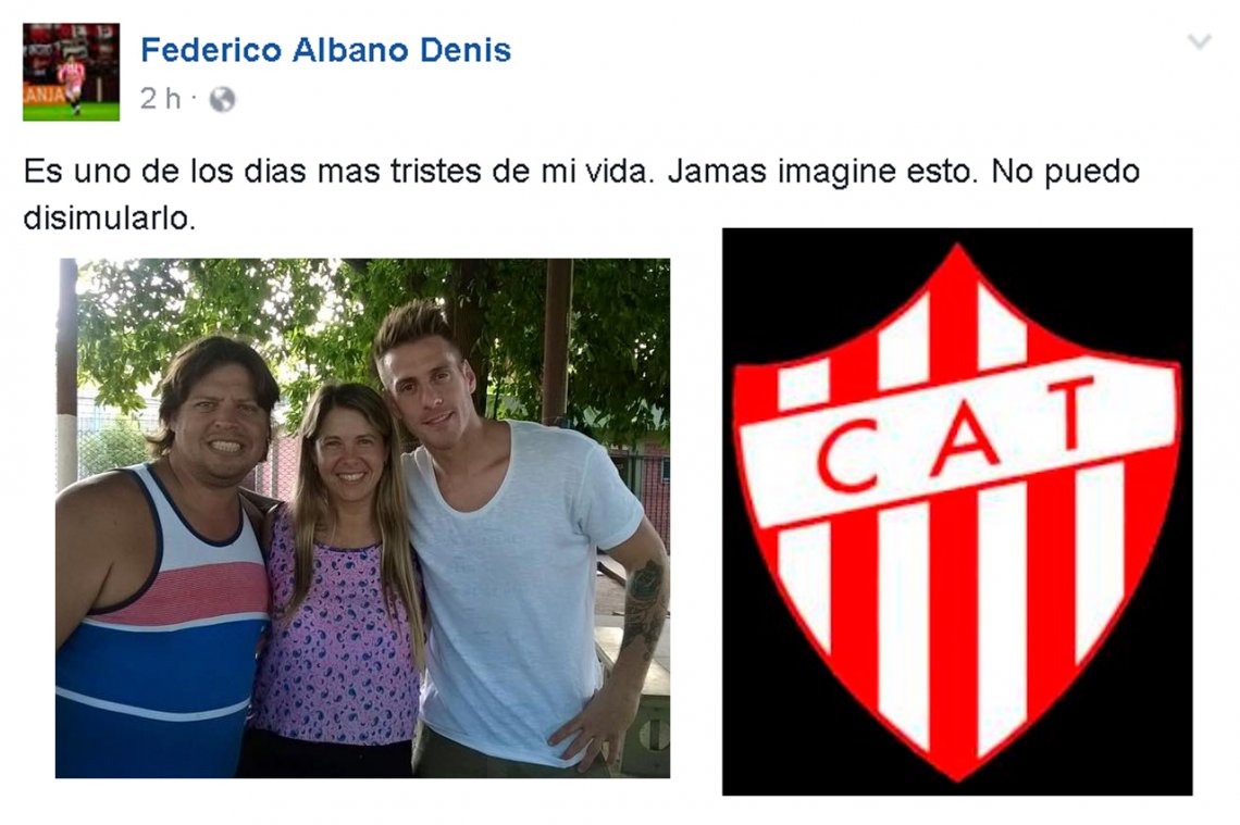 Federico, hermano del delantero, inició la polémica en su cuenta de Facebook al enterarse que Denis jugará los próximos 18 meses en Lanús. La rivalidad entre Talleres y el Granate es histórica, aunque en los últimos años creció más el duelo entre Banfield y Lanús. Sin embargo, no pudo ocultar su bronca y la reflejó de la siguiente manera: