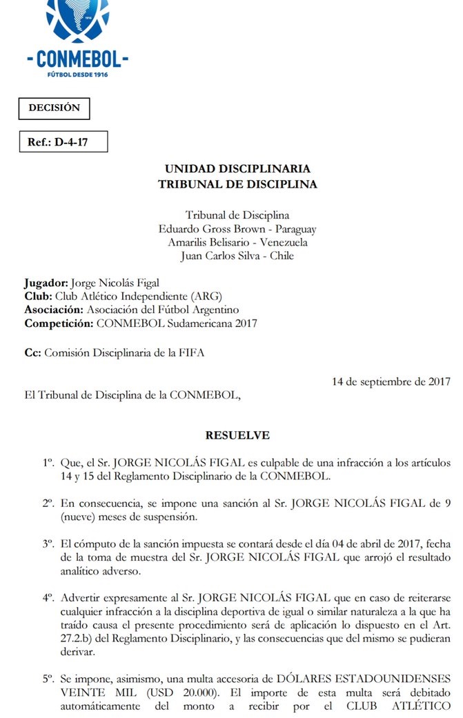 En el control antidoping se había detectado que el defensor de Independiente había hecho uso de sustancias prohibidas como son los diuréticos. Si bien el jugador lleva una suspensión provisoria desde mayo de este año, los directivos de la Confederación Sudamericana de Fútbol decidieron nueve meses de suspensión desde el 4 de abril, fecha de aquel encuentro contra el equipo peruano.