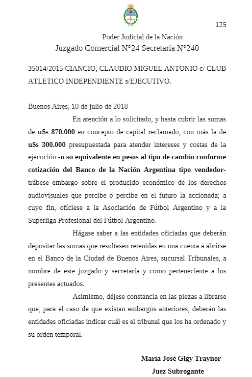 El ex dirigente de Independiente Claudio Ciancio volvió a embargar a Independiente ante la Justicia.