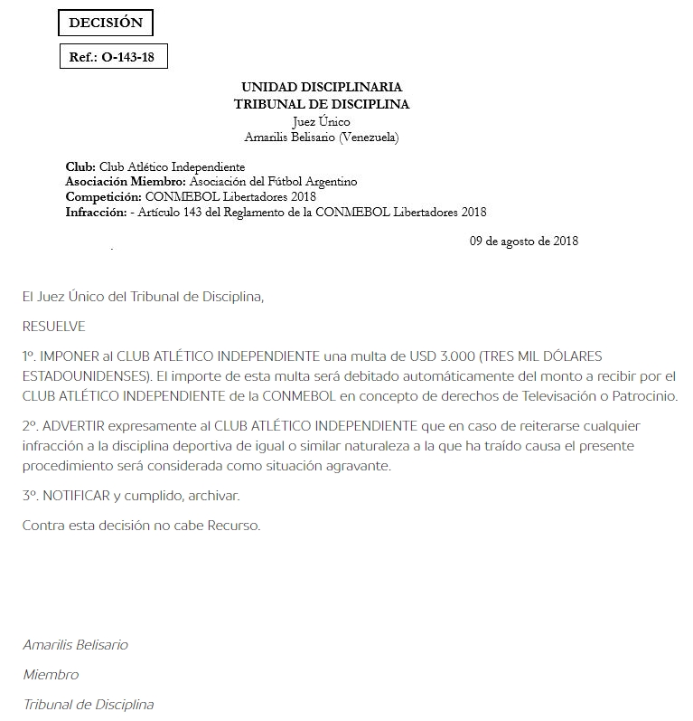 El organismo impuso una multa de 3.000 dólares, que serán descontados de los derechos de televisación. Si Independiente vuelve a cometer una infracción similar, la Conmebol lo considerará como agravante y la sanción puede ser peor.