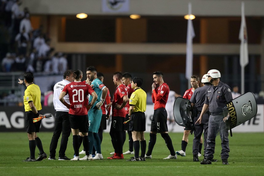 Lo peor, increíblemente, estaba por venir. A falta de 12 minutos, con el partido 0-0 y la clasificación de Independiente casi consumada, los hinchas del Santos arrojaron bombas de estruendo cerca del banco de suplentes del Rojo. Más gente se sumó para intentar romper las rejas y alambrados, desbordaron el operativo policial y el árbitro decidió suspender el partido.