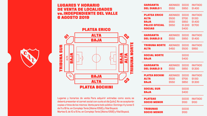 Para comprar entradas como socio, es requisito presentar el carnet con cuota de julio paga. Además del pago en ventanilla, se podrá abonar la entrada mediante el sitio https://socios.clubaindependiente.com.ar/, mediante las tarjetas Visa, Cabal o American Express.