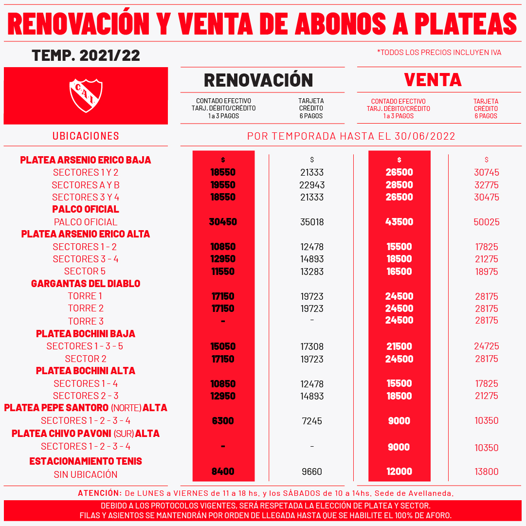 Independiente informó los precios para comprar o renovar los abonos a plateas hasta el final de la temporada 2021/2022.