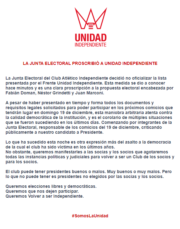 La agrupación emitió un comunicado de repudio donde denunciaron “una clara proscripción” y un “asalto a la democracia”. Aseguraron que Unidad Independiente presentó “en tiempo y forma todos los documentos y requisitos legales solicitados” por la Junta Electoral que terminó rechazando su fórmula.