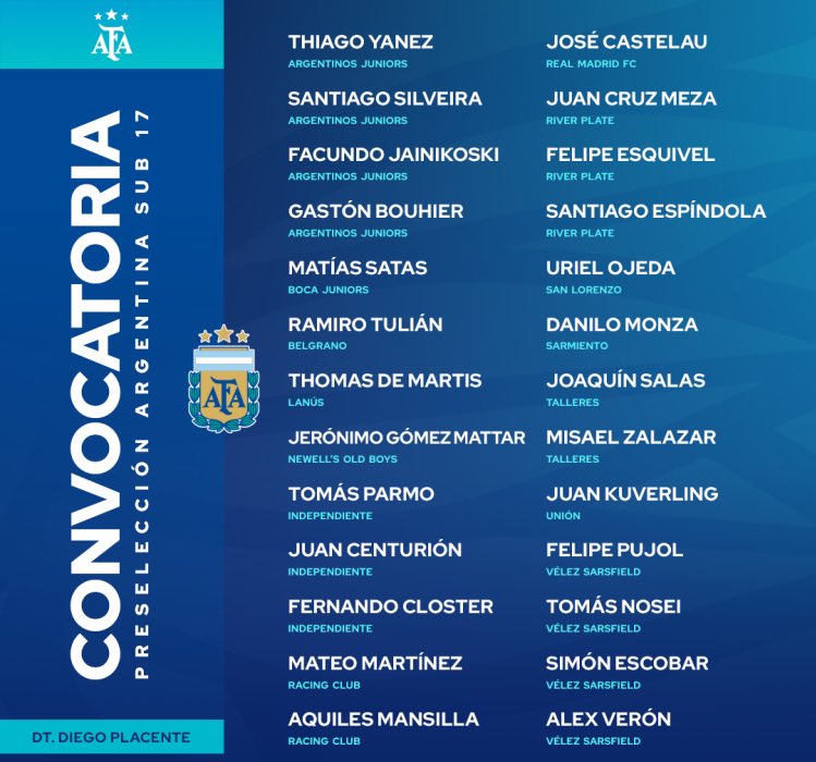 Juan Manuel Centurión, Fernando Closter y Tomás Parmo fueron citados por Diego Placente para los entrenamientos de la Selección Argentina Sub 17.