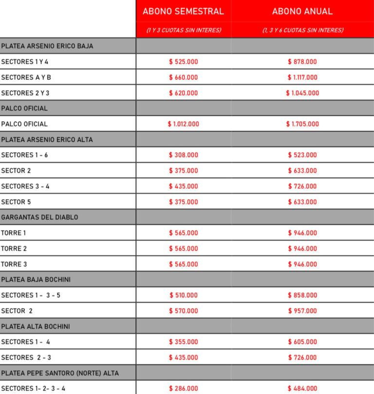 – Los socios que adquieran un ABONO ANUAL en tres (3) pagos (tarjeta de crédito) tendrán un reintegro equivalente al 5% sobre el monto finalmente abonado por cada ubicación, para ser canjeado en cualquiera de las tiendas físicas de Independiente Store (Sede Avellaneda, Sede Capital Federal, Estadio o Complejo Deportivo Avellaneda –ex tenis-). El reintegro no es acumulativo y regirá a partir de las 96 hs de realizado el pago del Abono.